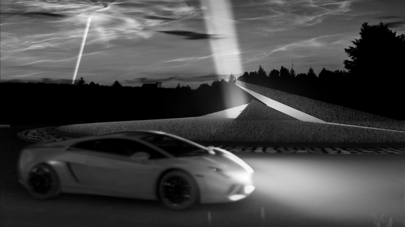 Lamborghini Road Monument The two roundabouts mark the position of the bull‘s horns. During the day the minimal intervation reveals only the traces of last night‘s breakthrough. During the night the sculpture rises to full power, so the landmark becomes visible from far away. The sculpture‘s fracture cuts the ground into a couple ... > show